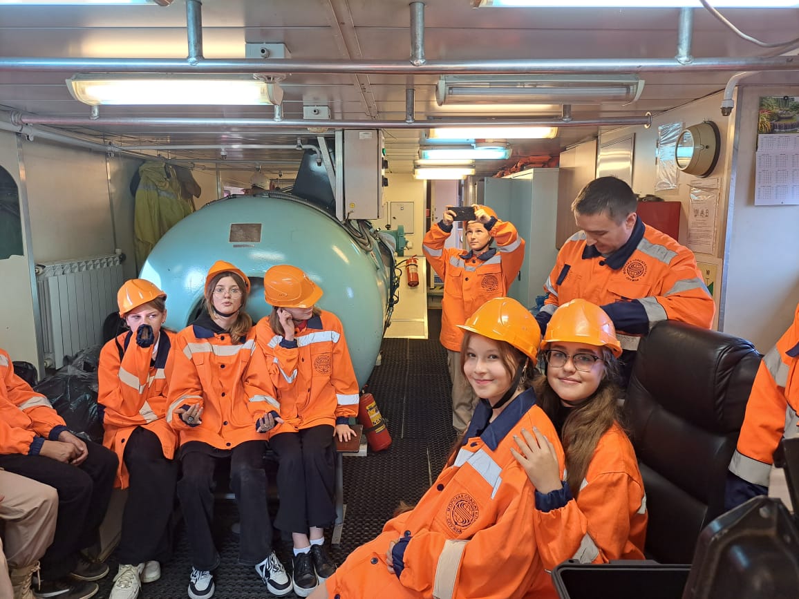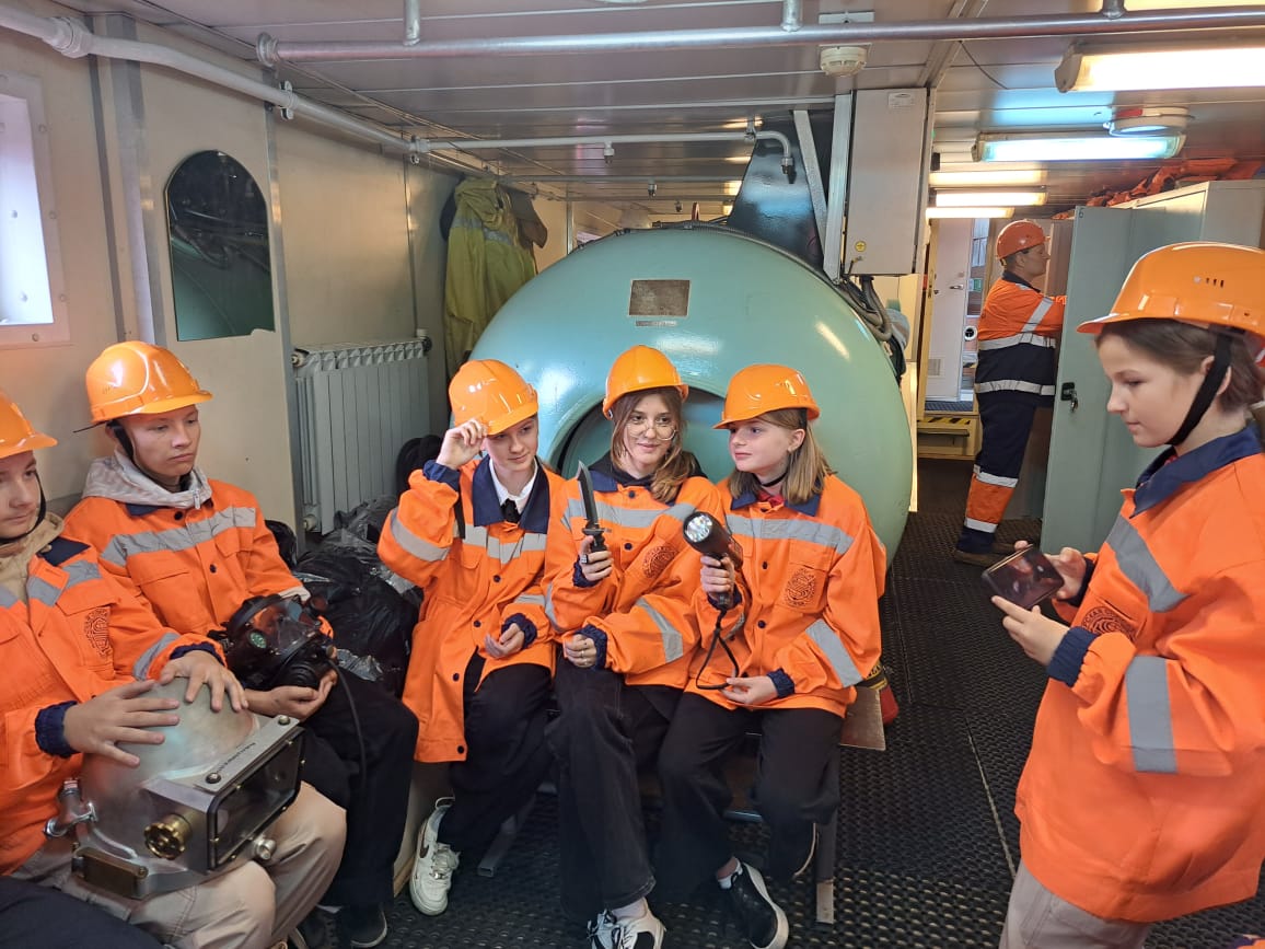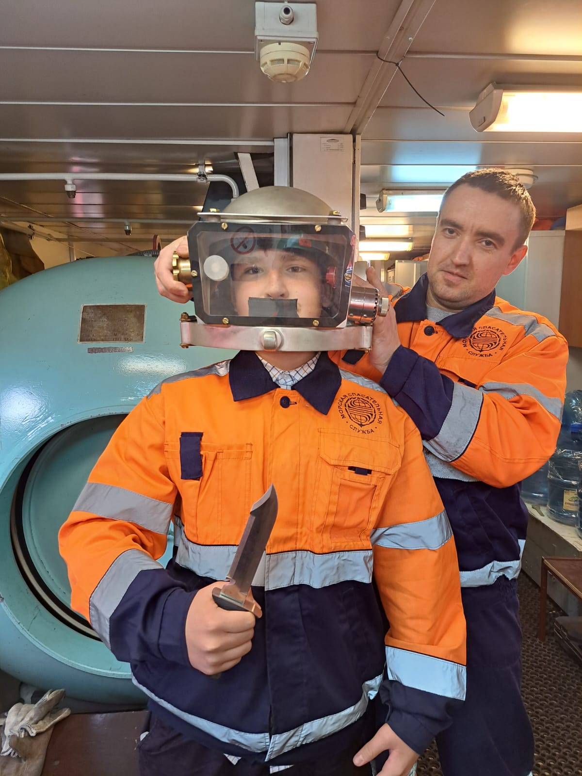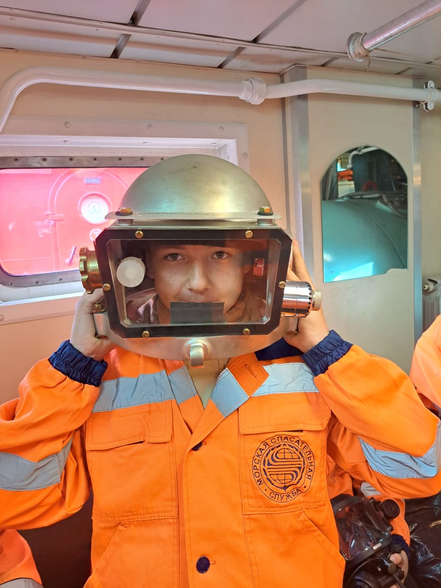 Затем молодёжи рассказали о спасательных операциях непосредственно на борту РВК «Водолаз Литвин» и МФАСС «Спасатель Карев». Ученики с особым интересом изучали водолазное и спасательное снаряжение и техническое устройство судов Морспасслужбы.