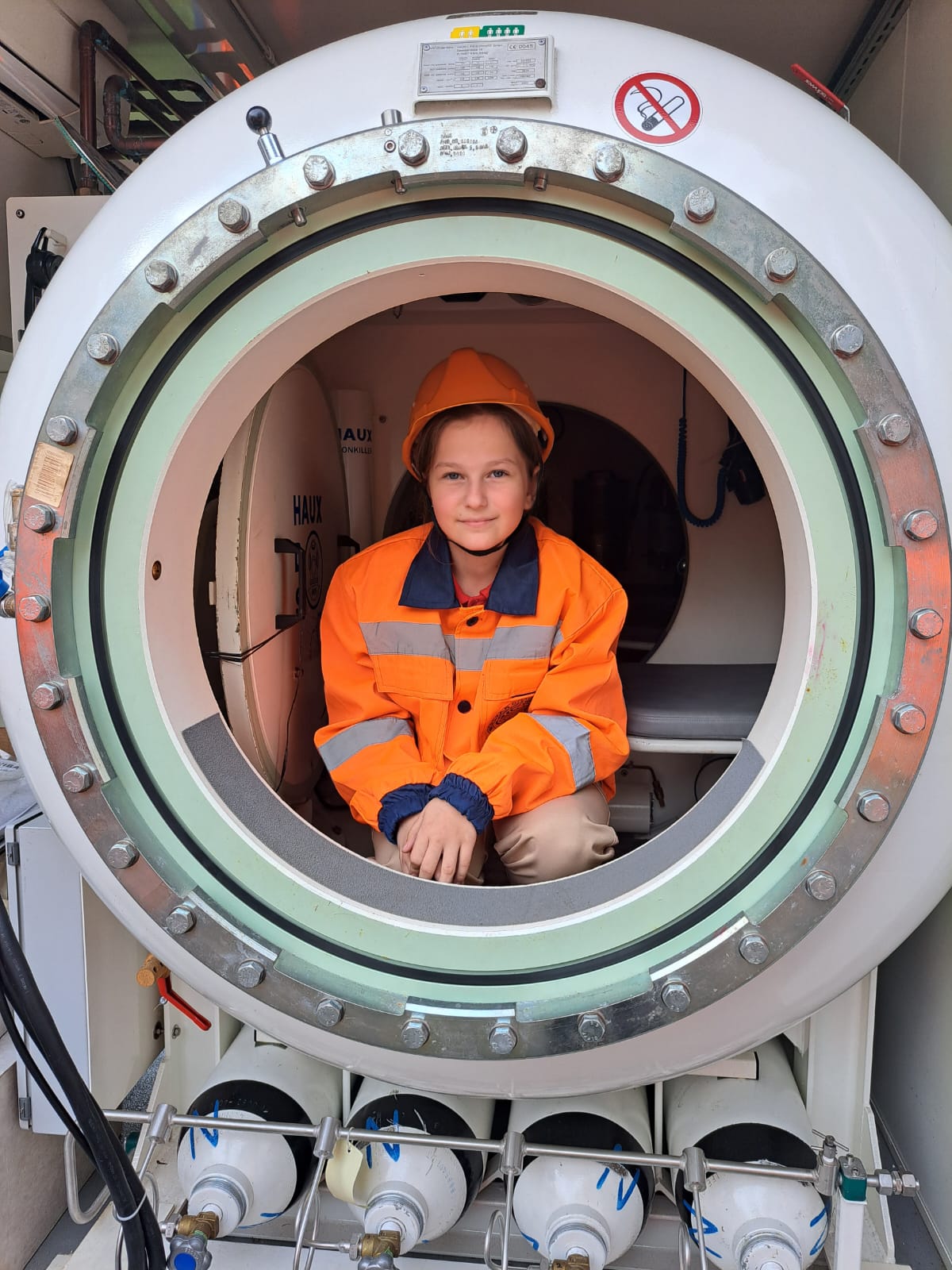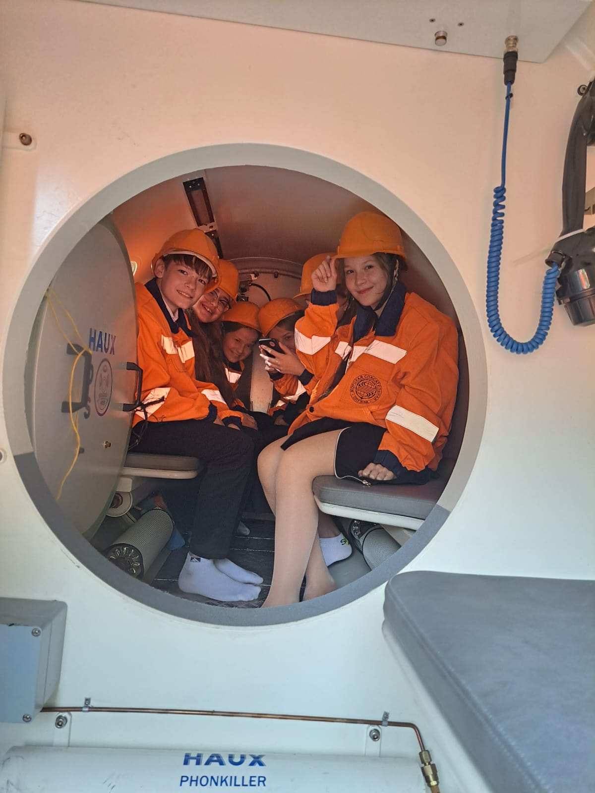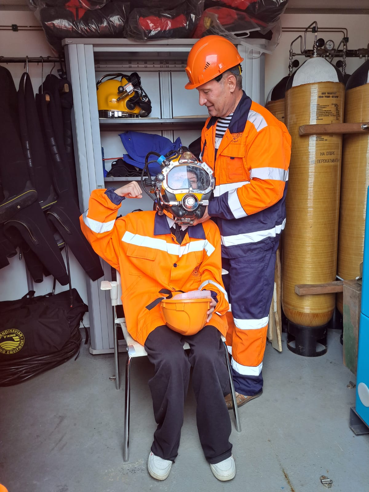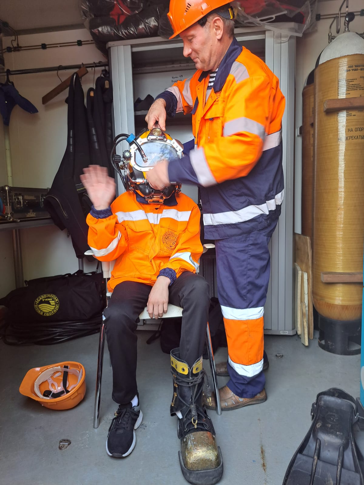 Затем молодёжи рассказали о спасательных операциях непосредственно на борту РВК «Водолаз Литвин» и МФАСС «Спасатель Карев». Ученики с особым интересом изучали водолазное и спасательное снаряжение и техническое устройство судов Морспасслужбы.