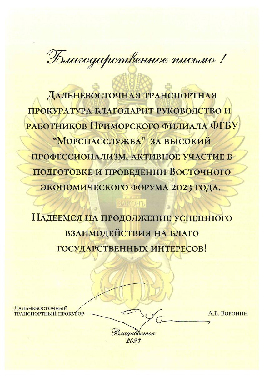 Сегодня заместитель транспортного прокурора Алексей Легезин вручил Директору Приморского филиала Морспасслужбы этот документ, в котором в частности, отмечено, что Дальневосточная транспортная прокуратура благодарит руководство и работников Приморского филиала Морспасслужбы за высокий профессионализм и активное участие в подготовке и проведении Восточного экономического форума в 2023 году. Специалисты ФГБУ «Морспасслужба» в дни ДЭФ с высоким качеством выполнили ряд специальных мероприятий для обеспечения морской безопасности и предотвращения ЧС в акватории порта Владивосток.