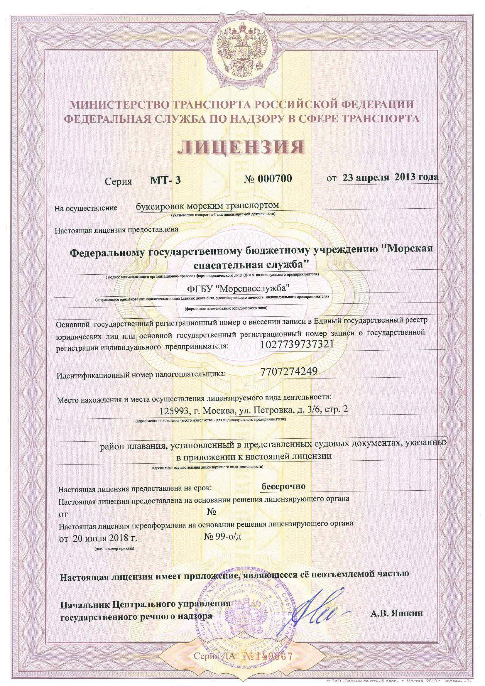 В свою очередь, межрегиональное территориальное управление Федеральной службы по надзору в сфере транспорта по Центральному Федеральному округу в соответствии с Федеральным законом «О лицензировании отдельных видов деятельности» своим приказом также внесло изменения в реестр лицензий. Уведомление о внесении изменений в реестр лицензий на деятельность по осуществлению буксировок морским транспортом, касающееся буксира «Николай Семенченко» также направлено Морспасслужбе.