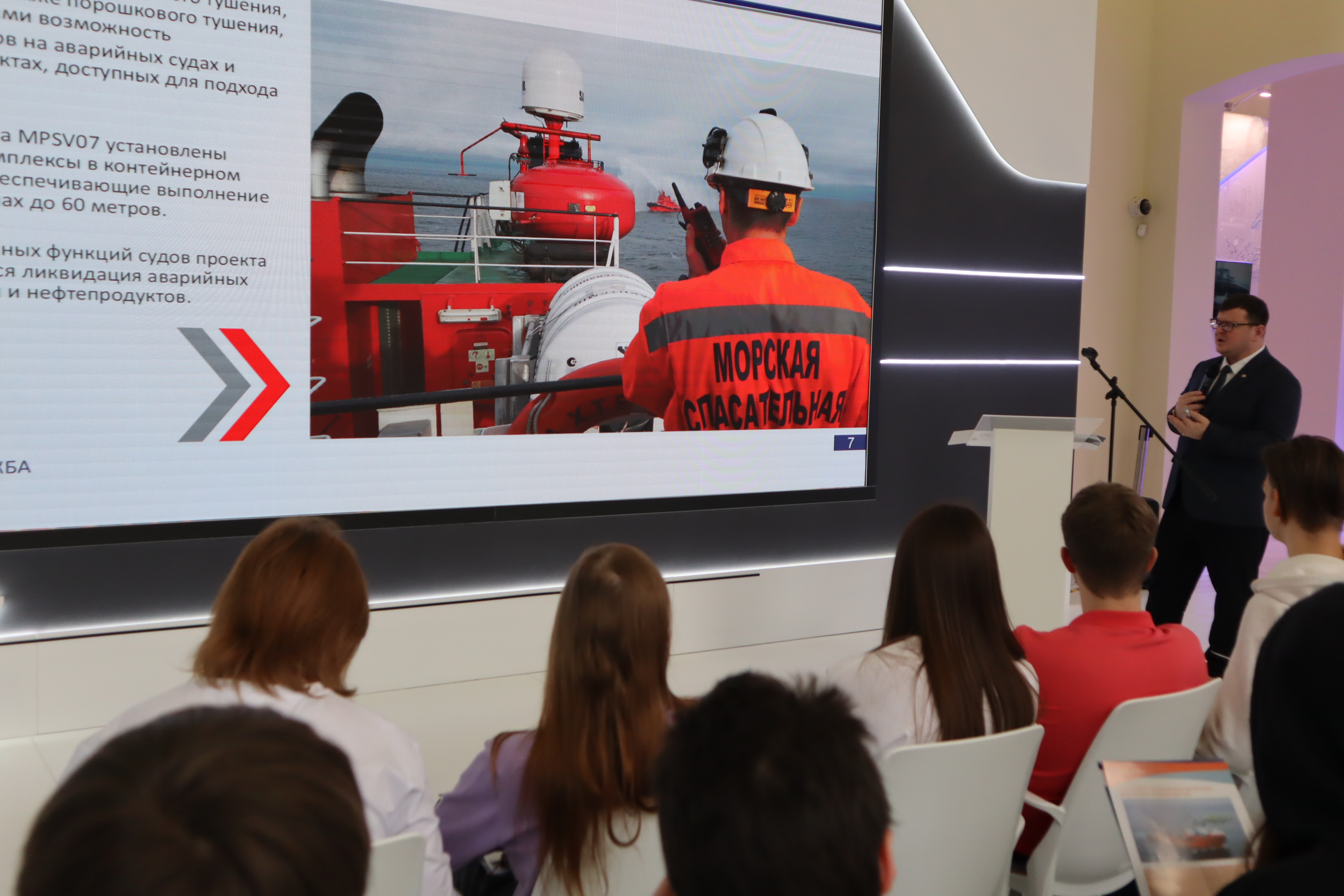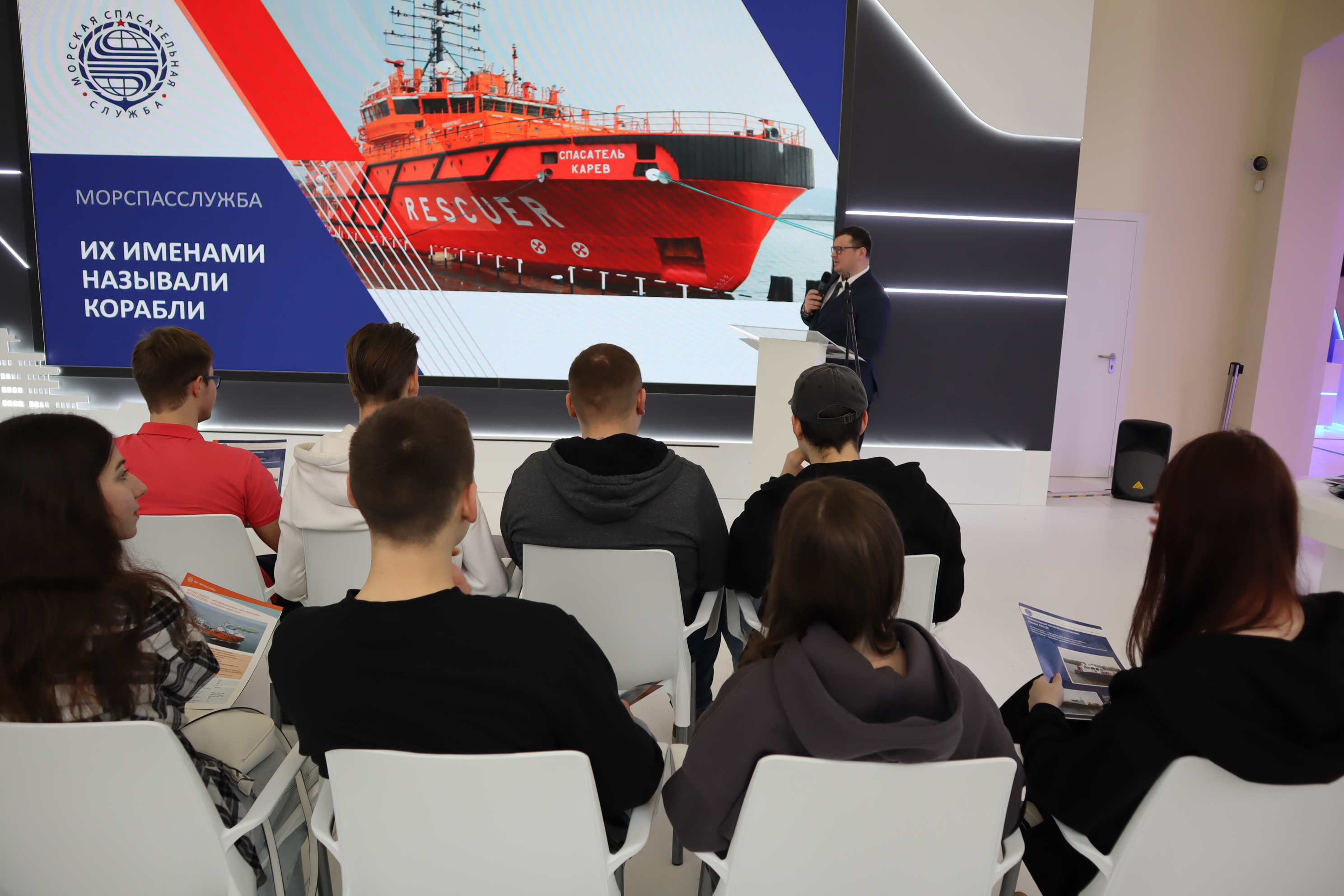 На экспозиции Минтранса выставки «Россия» молодым посетителям специалисты Морспасслужбы прочитали лекцию о легендарных морских спасателях
