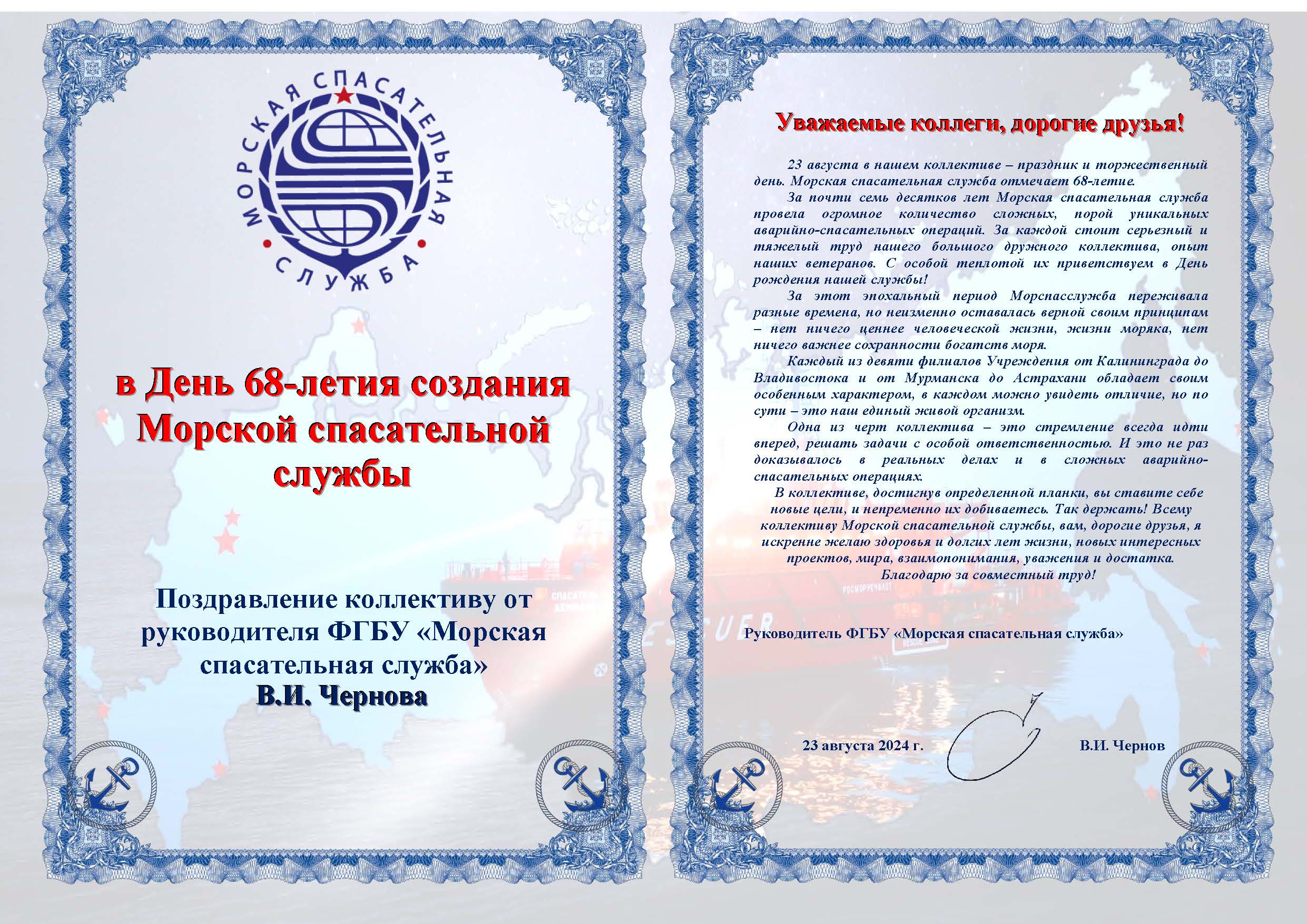 Поздравление руководителя ФГБУ "Морспасслужба" Виктора Чернова коллективу с 68-летием создания учреждения