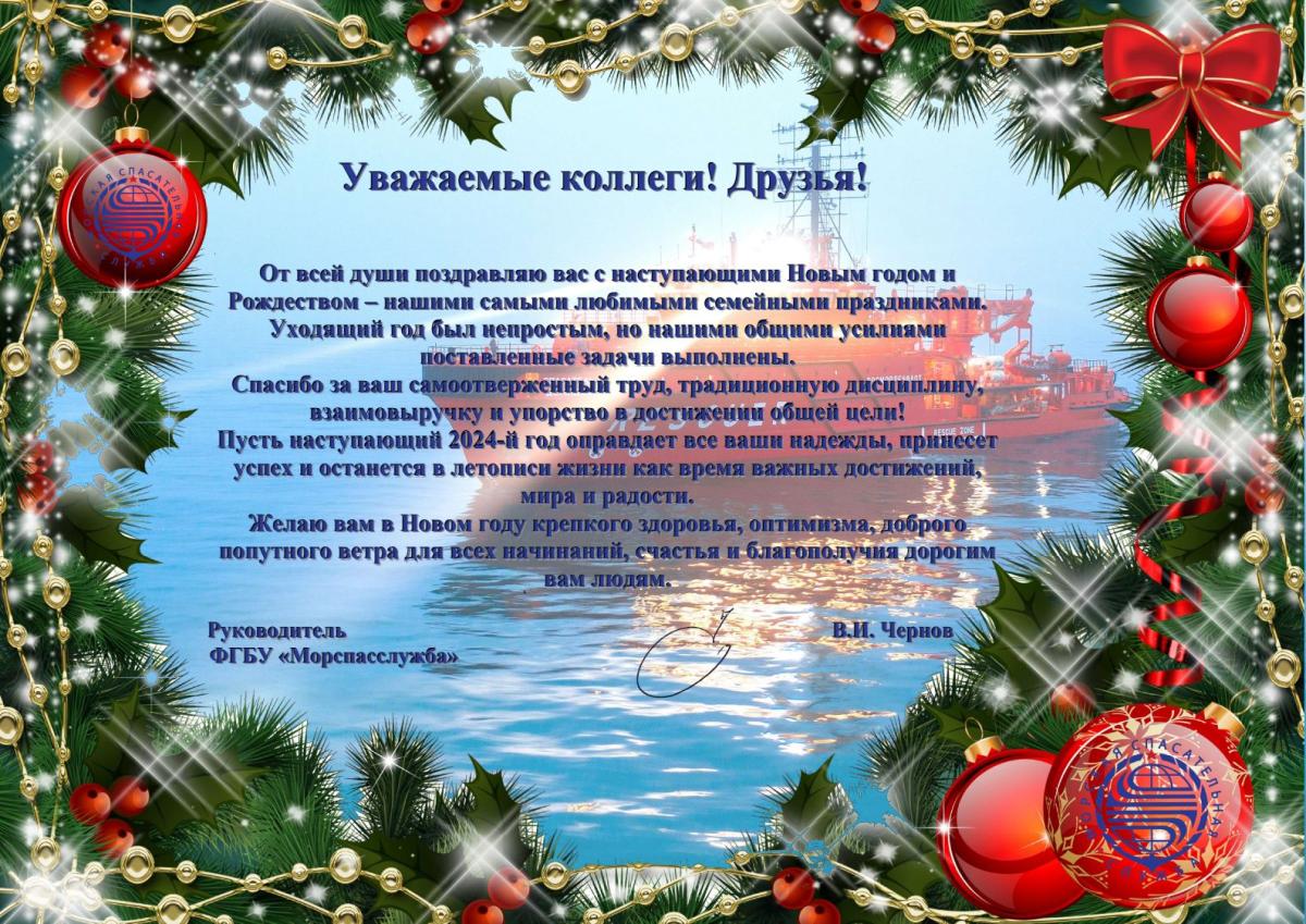 Поздравление руководителя ФГБУ "Морспасслужба" Виктора Ивановича Чернова коллективу с наступающим Новым Годом. Официальный сайт морской спасательной службы. Министерство транспорта Российской Федерации. Федеральное агентство морского и речного транспорта.