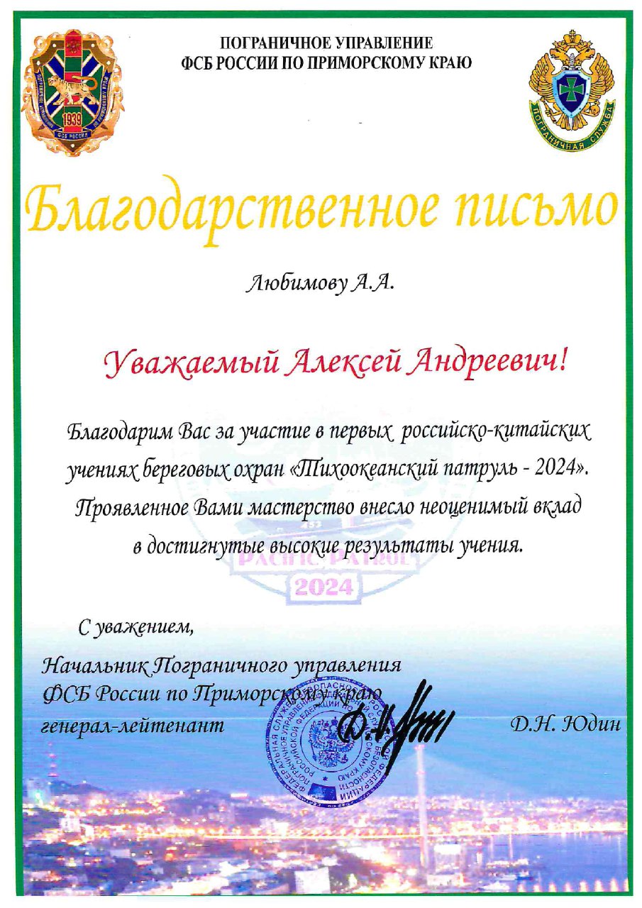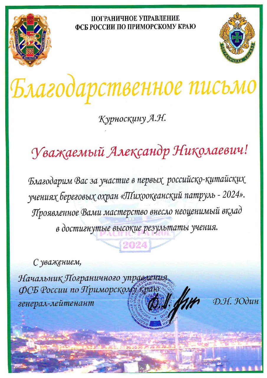 ВЛАДИВОСТОК. Благодарственными письмами от начальника Пограничного управления ФСБ России по Приморскому краю за участие в подготовке и проведении первых Российско-Китайских учений «Тихоокеанский патруль 2024» награждены директор Приморского филиала ФГБУ «Морспасслужба» Иван Владимирович Агаревский, заместитель директора Приморского филиала ФГБУ «Морспасслужба» по аварийно-спасательной работе и ликвидации разлива нефти Алексей Андреевич Любимов и капитан морского водолазного судна «Ростов Великий» Александр Николаевич Курноскин. Кроме того, слова благодарности от пограничников за профессиональную работу были переданы всему коллективу Приморского филиала.