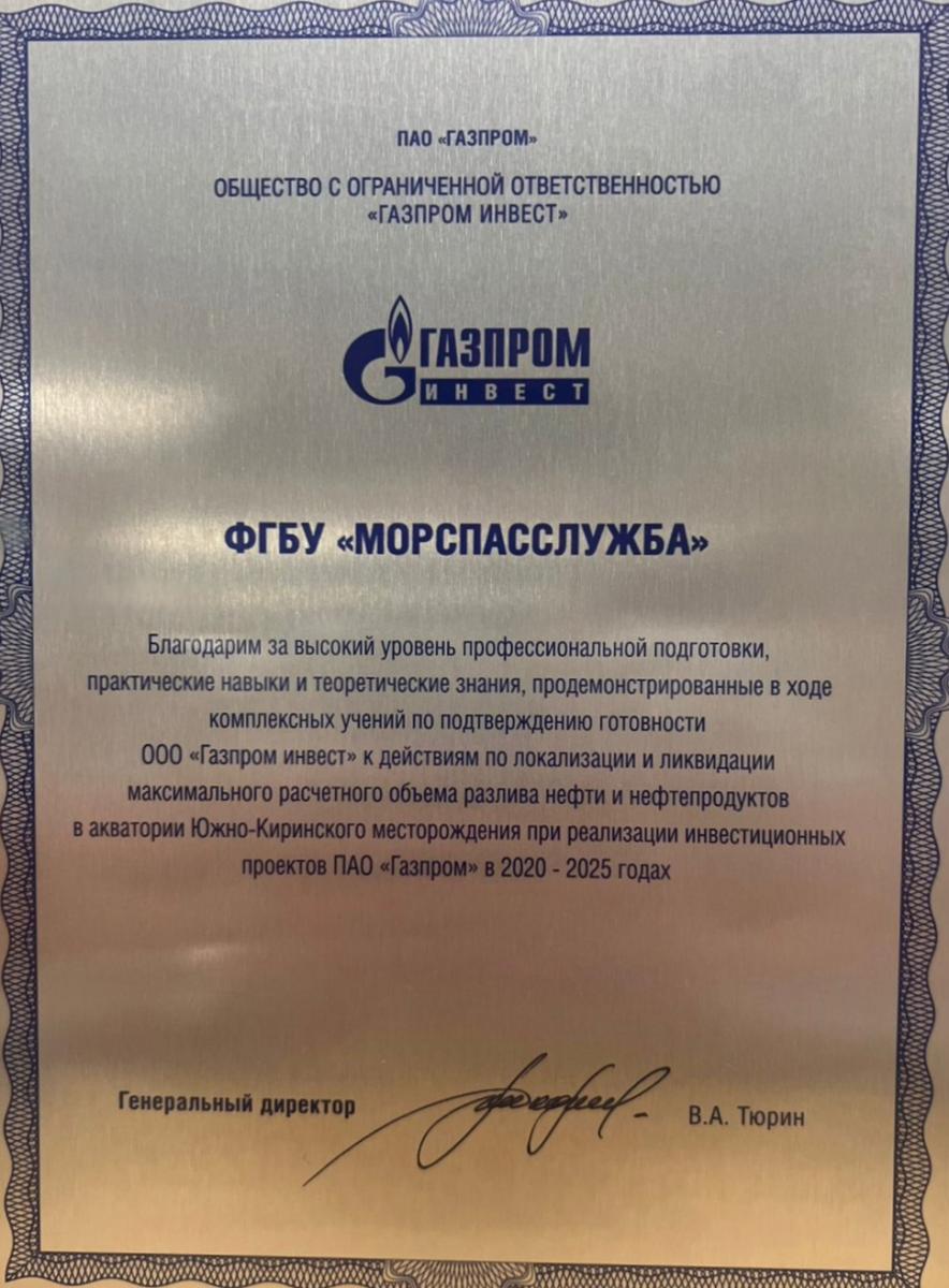 МОСКВА. Руководителю Морспасслужбы Виктору Чернову вручена благодарность от ООО «Газпром инвест». Награда вручена за высокий уровень профессиональной подготовки, практические навыки и теоретические знания морских спасателей и экипажей спасательных судов, продемонстрированные в ходе комплексных учений по подтверждению готовности ООО «Газпром инвест» к действиям по локализации и ликвидации максимального расчетного объёма разлива нефти и нефтепродуктов в акватории Охотского моря при реализации инвестиционных проектов.