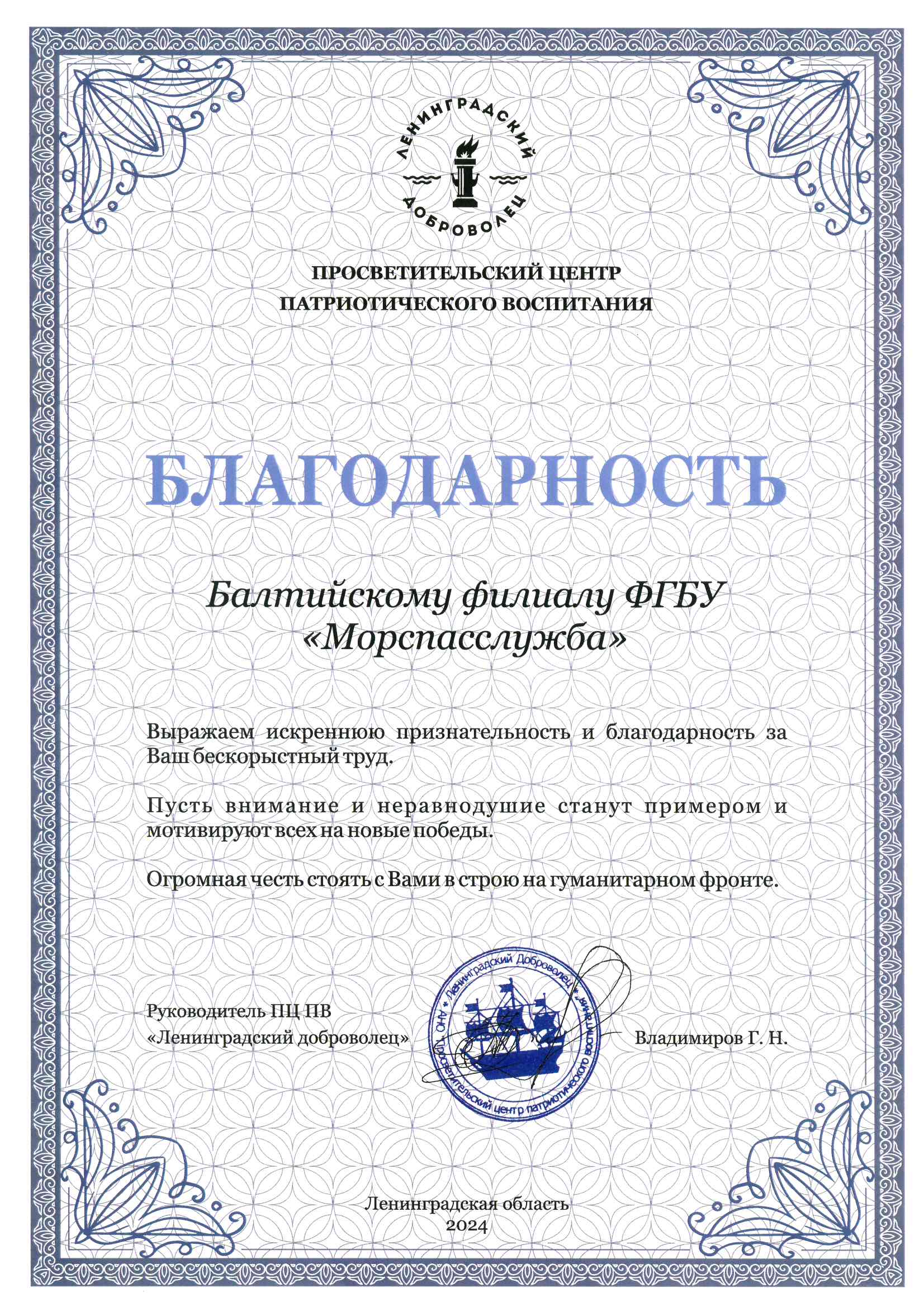 САНКТ-ПЕТЕРБУРГ. Руководству Балтийского филиала ФГБУ «Морспасслужба» направлена Благодарность Просветительского центра патриотического воспитания «Ленинградский доброволец» за участие работников филиала в поддержке участников военной спецоперации.