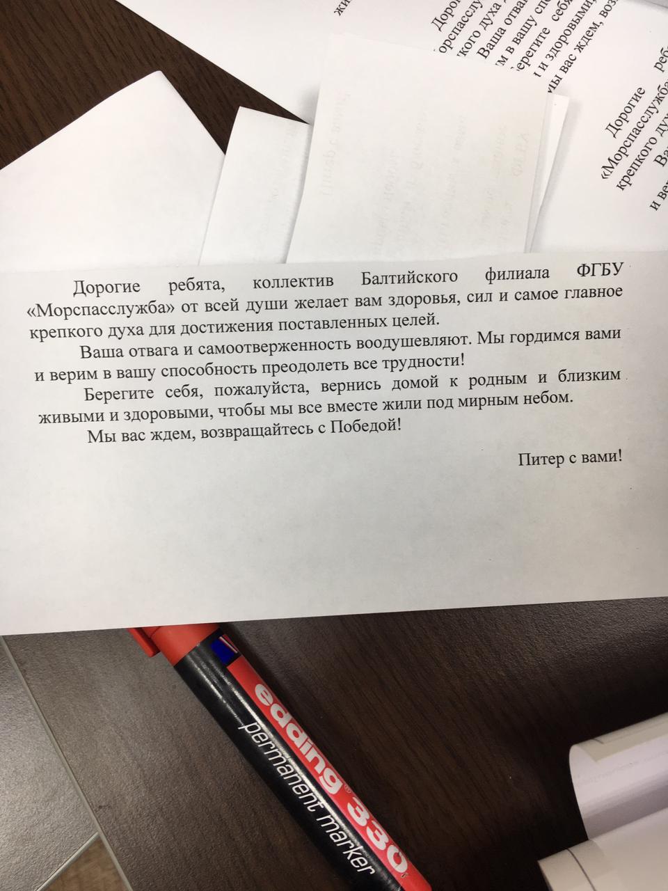 Балтийцы перечисляли небольшие суммы из своей зарплаты, чтобы помогать бойцам на передовой, поставлять им то, что не стоит на вооружении Минобороны. К примеру, за личный счёт неравнодушных сотрудников филиала закуплены комплекты камуфляжных костюмов «Горка» и тактических ботинок (берцев) для того, чтобы у ребят была возможность сделать свою боевую работу чуть более комфортно и удобно. Морские спасатели собрали для бойцов СВО наборы сладостей, продуктов и сигарет.