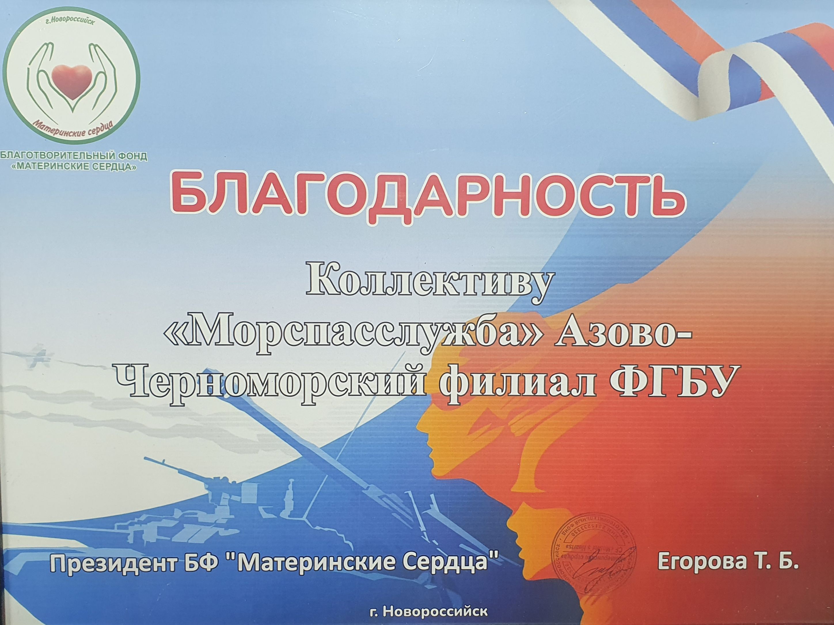 НОВОРОССИЙСК. Благотворительный фонд «Материнские сердца» направил благодарность коллективу Азово-Черноморского филиала ФГБУ «Морспасслужба» за активную позицию и достойный вклад в успешное решение боевых задач нашими военнослужащими в зоне СВО.