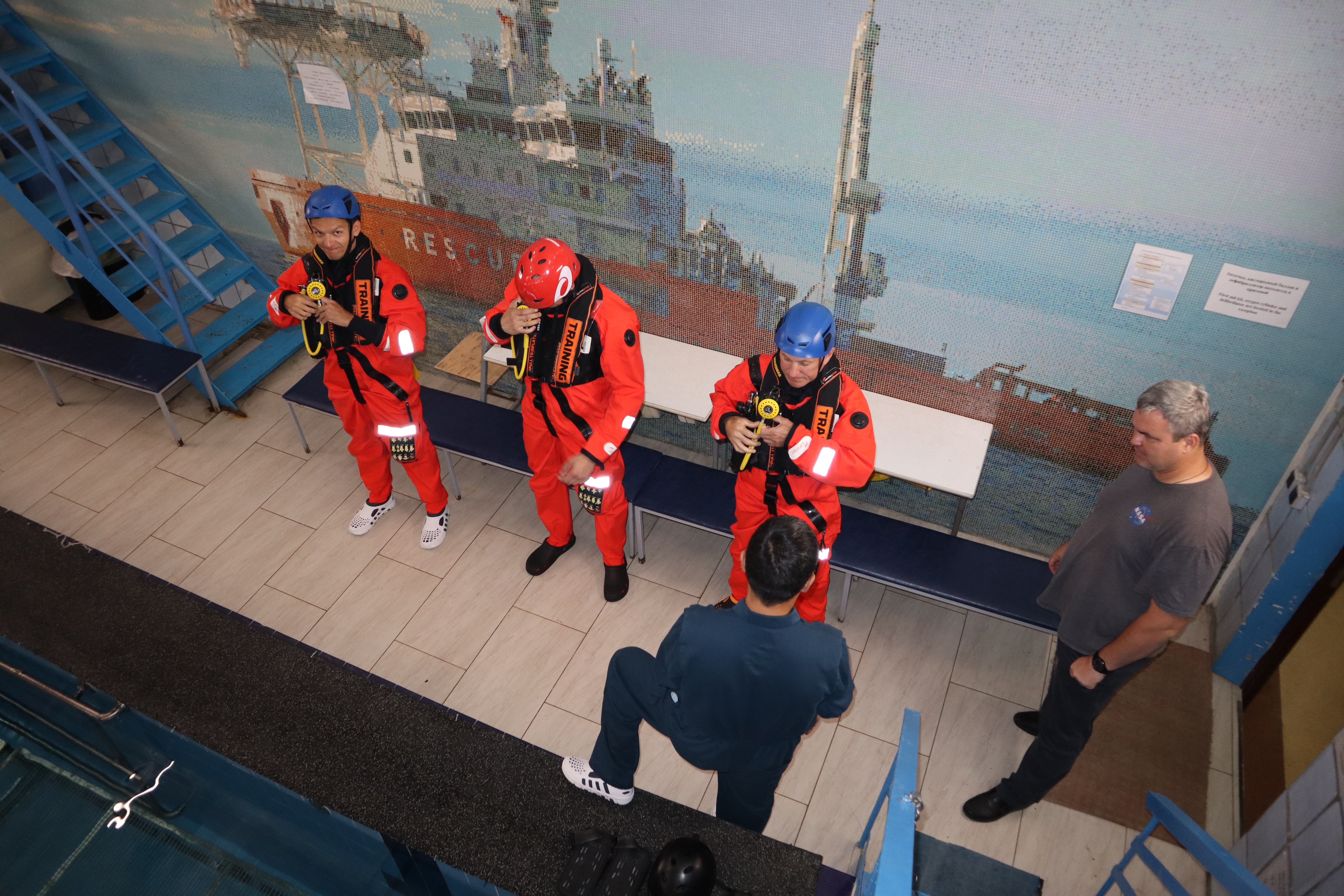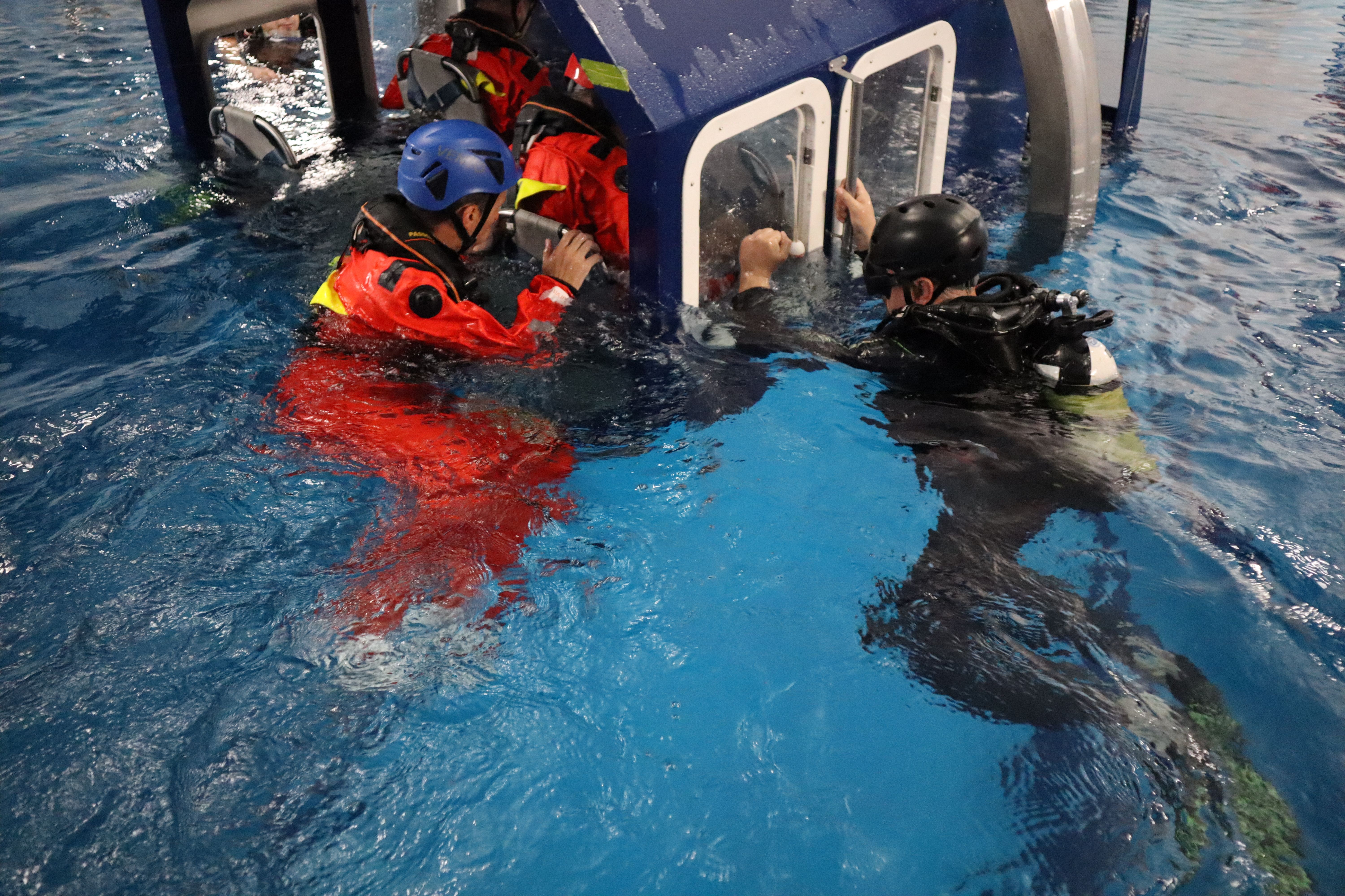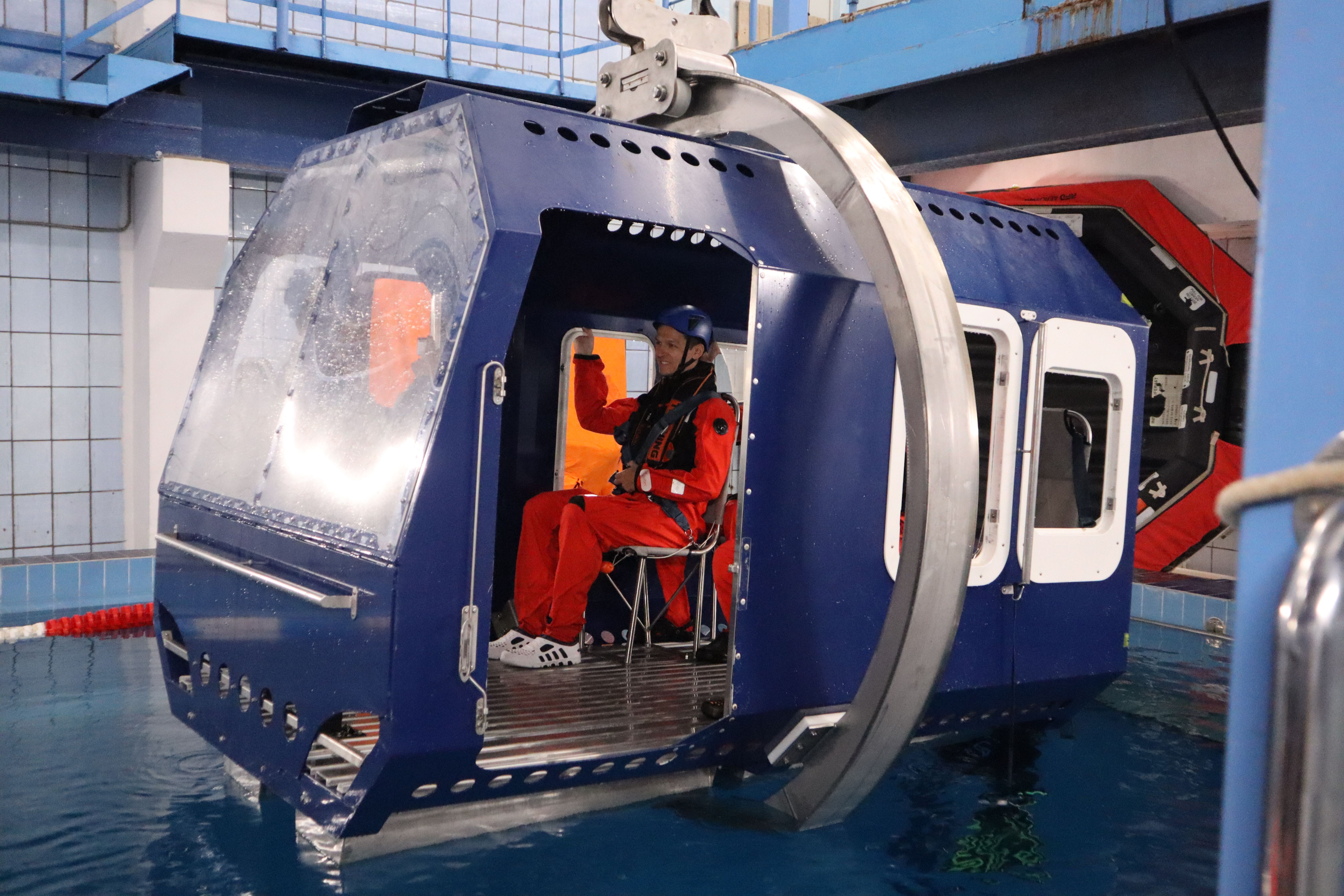 Практика проводилась в бассейне Учебно-тренировочного центра Морспасслужбы с использованием тренажера-симулятора вертолётной кабины по отработке навыков эвакуации из неё при аварийном приводнении.
