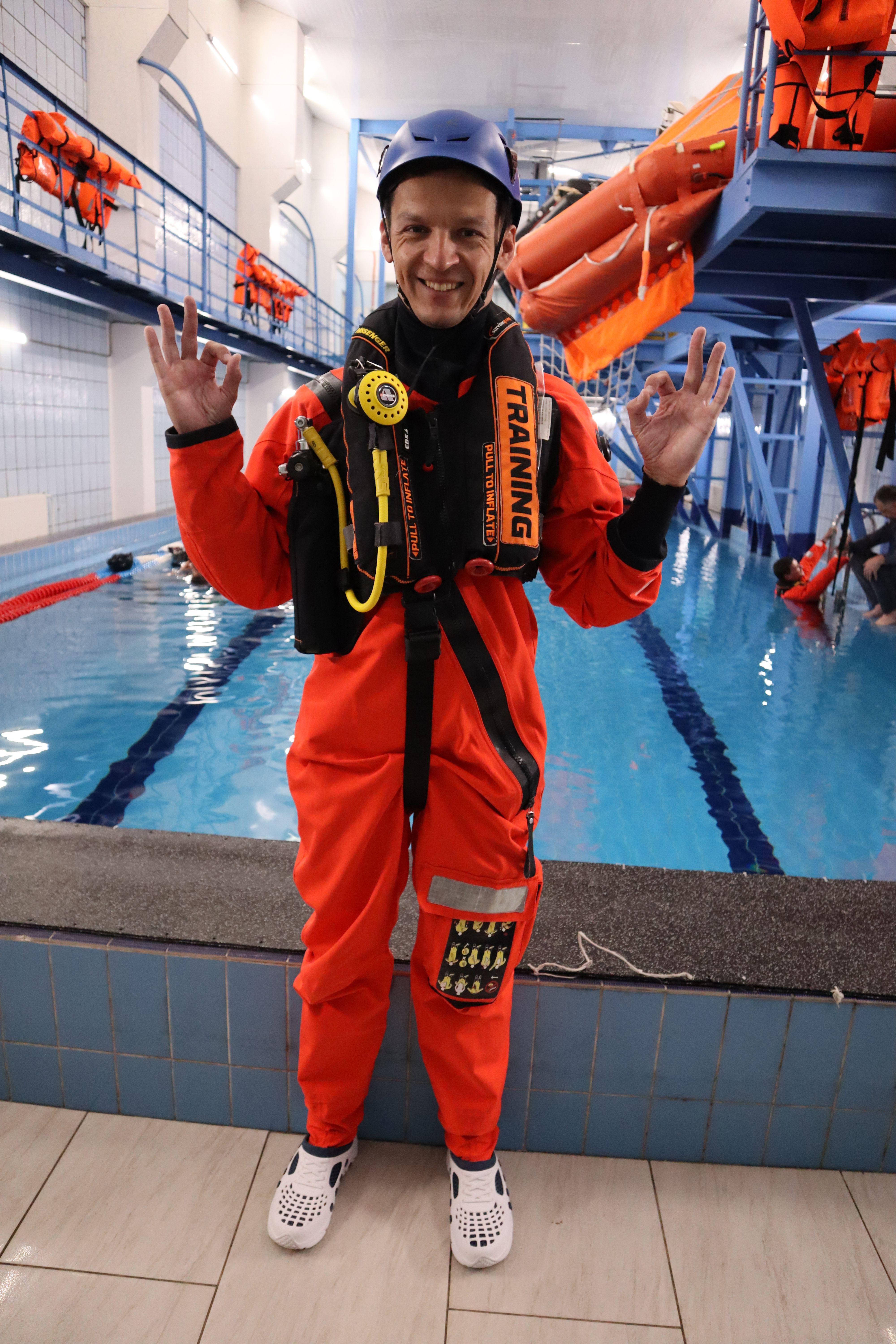 Константин Борисов, имея квалификацию «водолаз» и большой опыт фридайвинга и погружений с аквалангом, успешно освоил все практические упражнения по использованию аварийной дыхательной системы на сжатом воздухе и получил навыки по экстренному покиданию симулятора вертолётной кабины под водой. Практические занятия в бассейне были реально приближены к аварийной ситуации – симулятор вертолётной кабины в ходе тренировки погружается в воду как в вертикальном положении, так и с переворотом на 180 градусов.