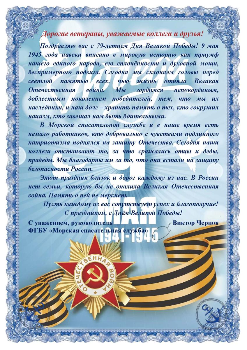 Пусть каждому из вас сопутствует успех и благополучие! С праздником, с Днём Великой Победы!С уважением, руководитель ФГБУ "Морская спасательная служба" Виктор Чернов