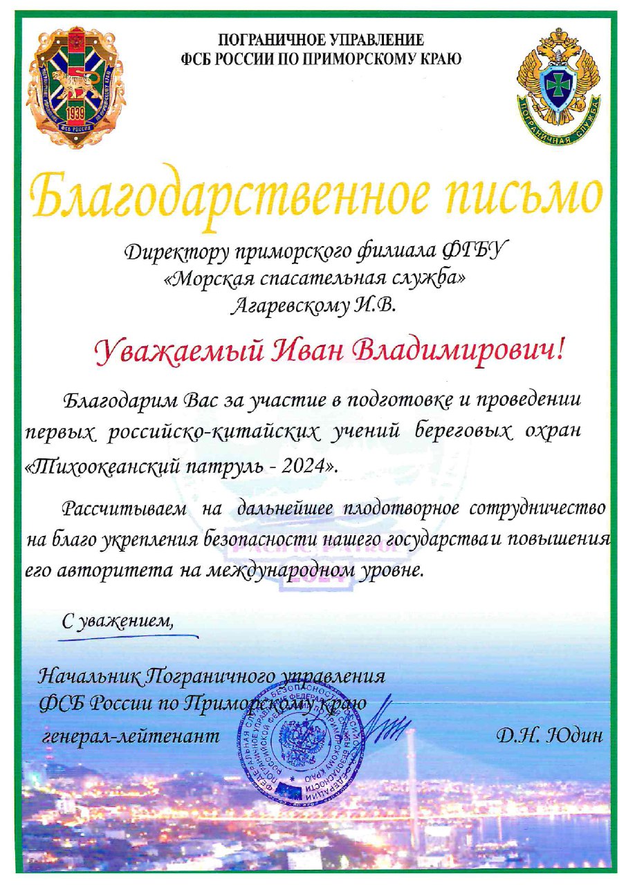 ВЛАДИВОСТОК. Благодарственными письмами от начальника Пограничного управления ФСБ России по Приморскому краю за участие в подготовке и проведении первых Российско-Китайских учений «Тихоокеанский патруль 2024» награждены директор Приморского филиала ФГБУ «Морспасслужба» Иван Владимирович Агаревский, заместитель директора Приморского филиала ФГБУ «Морспасслужба» по аварийно-спасательной работе и ликвидации разлива нефти Алексей Андреевич Любимов и капитан морского водолазного судна «Ростов Великий» Александр Николаевич Курноскин. Кроме того, слова благодарности от пограничников за профессиональную работу были переданы всему коллективу Приморского филиала.