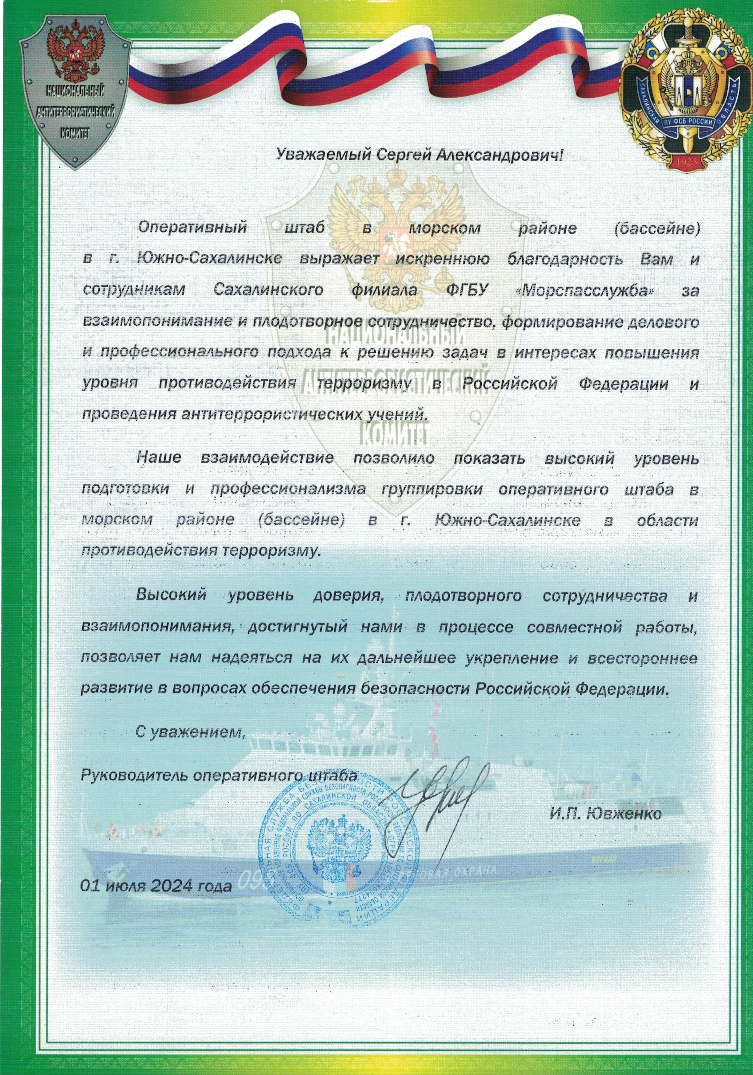 ЮЖНО-САХАЛИНСК – КОРСАКОВ. Руководство оперативного штаба Национального антитеррористического Комитета (НАК) направило в Сахалинский филиал Морской спасательной службы благодарственное письмо со словами признательности за активное содействие группировке оперативного штаба в морском районе (бассейне) в интересах повышения уровня противодействия терроризму в городе Южно-Сахалинске и в стране в целом.