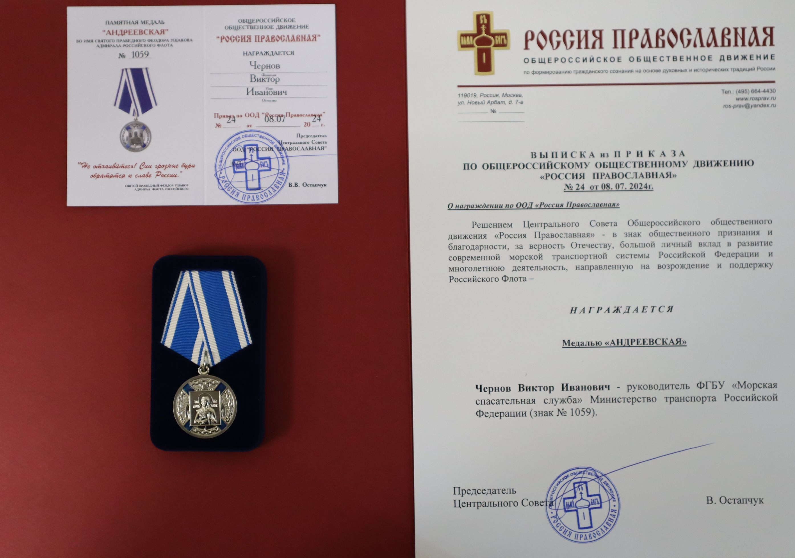 Решением Центрального Совета Общероссийского общественного движения «Россия православная» в знак общественного признания и благодарности, за верность Отечеству и большой личный вклад в развитие современной морской транспортной системы Российской Федерации, за многолетнюю деятельность, направленную на возрождение и поддержку Российского флота, руководитель ФГБУ «Морспасслужба» Виктор Чернов награждён медалью «Андреевская» с изображением святого праведного Фёдора Ушакова, адмирала Российского флота.