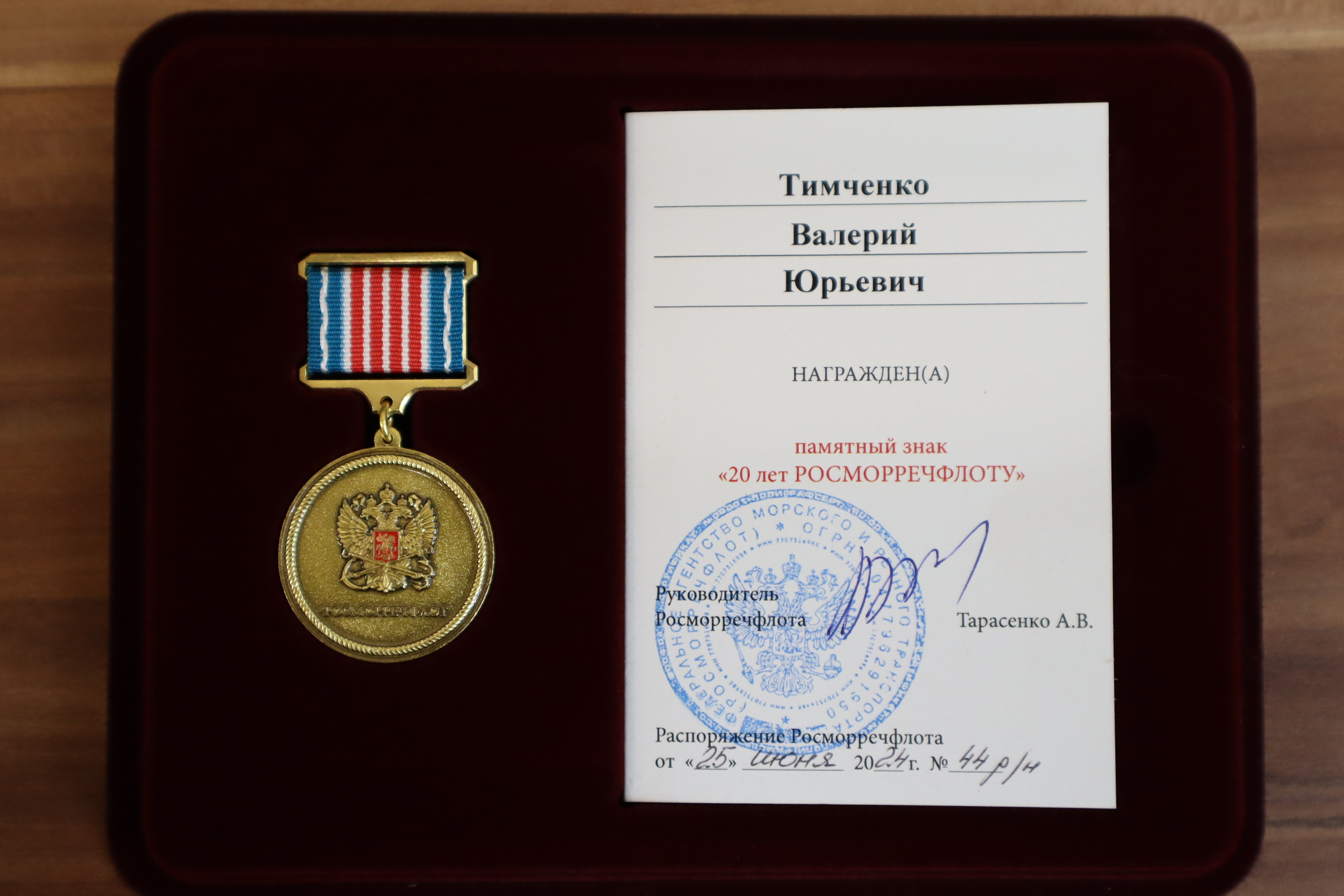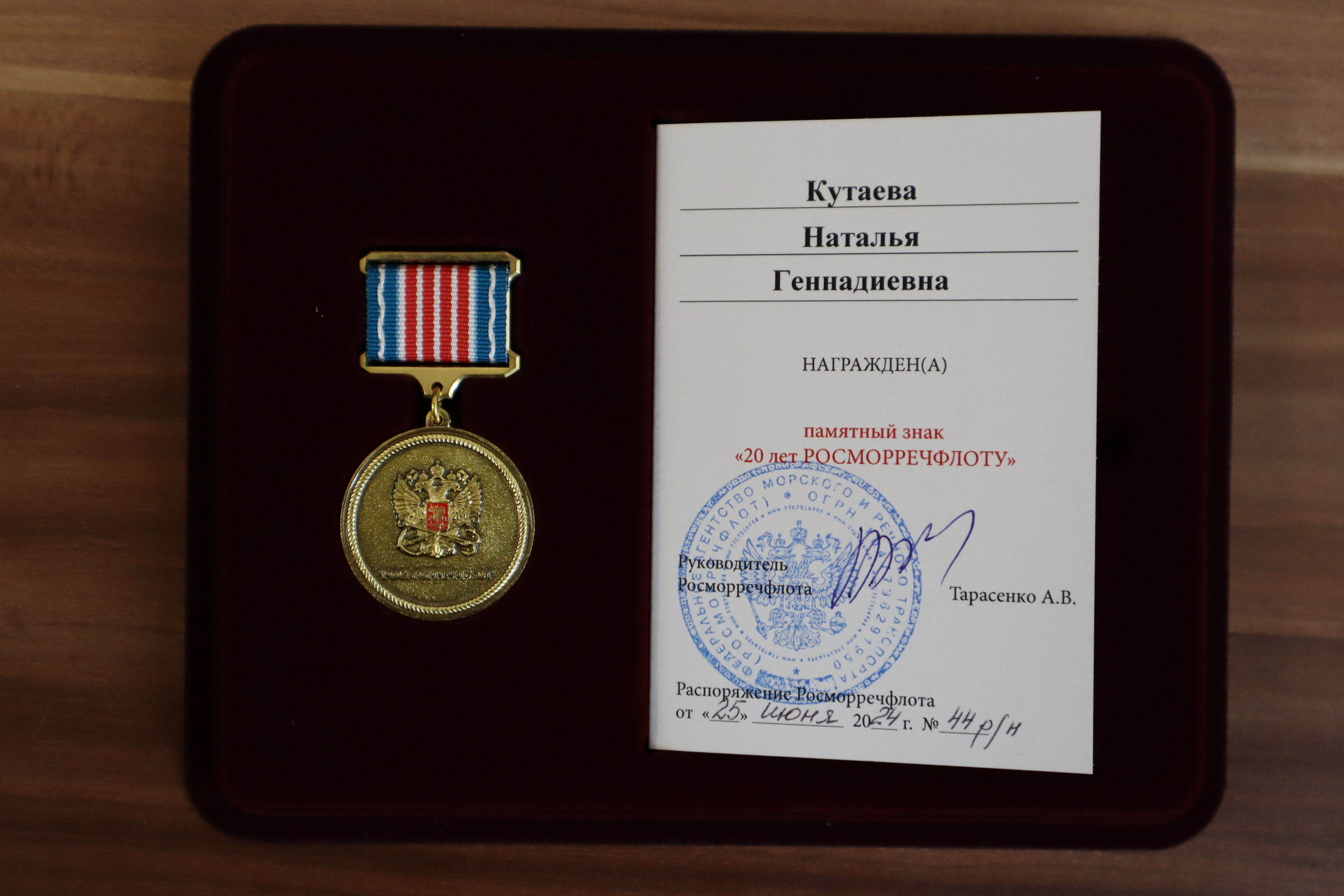По поручению Росморречфлота памятные знаки «20 лет Росморречфлоту» были вручены за добросовестную работу и значительный личный вклад в развитие учреждения отличившимся работникам ФГБУ «Морспасслужба» – советнику руководителя Наталье Кутаевой и заместителю начальника управления по аварийно-спасательным работам Валерию Тимченко.